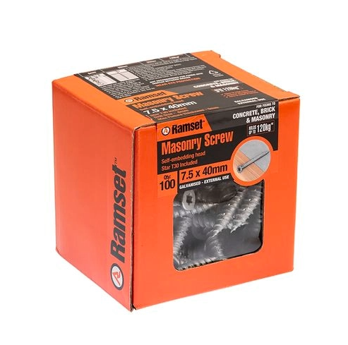 The Ramset Masonry screw is a 100% removable masonry anchor. Its ideal use is in concrete, brick (hollow and solid) and masonry. The rotation setting method of installation is subject to low expansive pressure, therefore does not burst the substrate.
