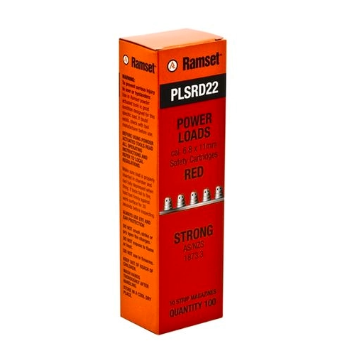 Power Loads for the Low Velocity Powder Actuated Tools provide the energy to drive the Pins through material and into the substrate. For use with strip feed tools, Ramset FormMaster™, Ramset FrameMaster. Red - strong strength.